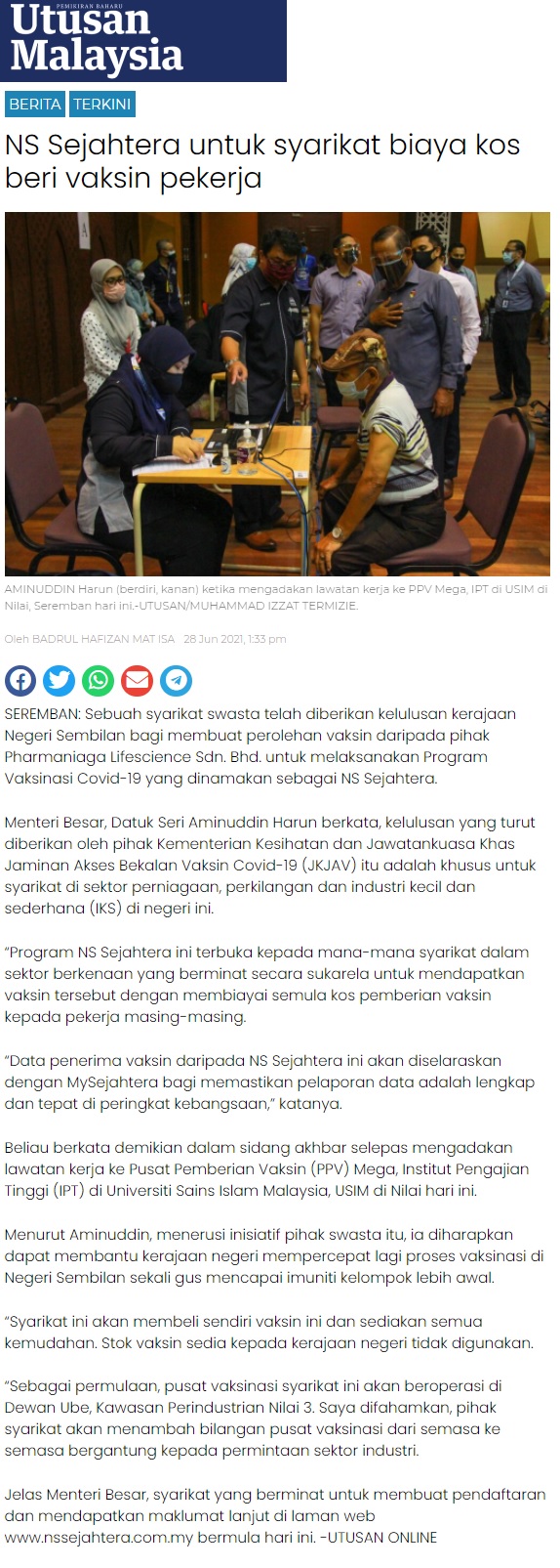 NS Sejahtera Untuk Syarikat Biaya Kos Beri Vaksin Pekerja