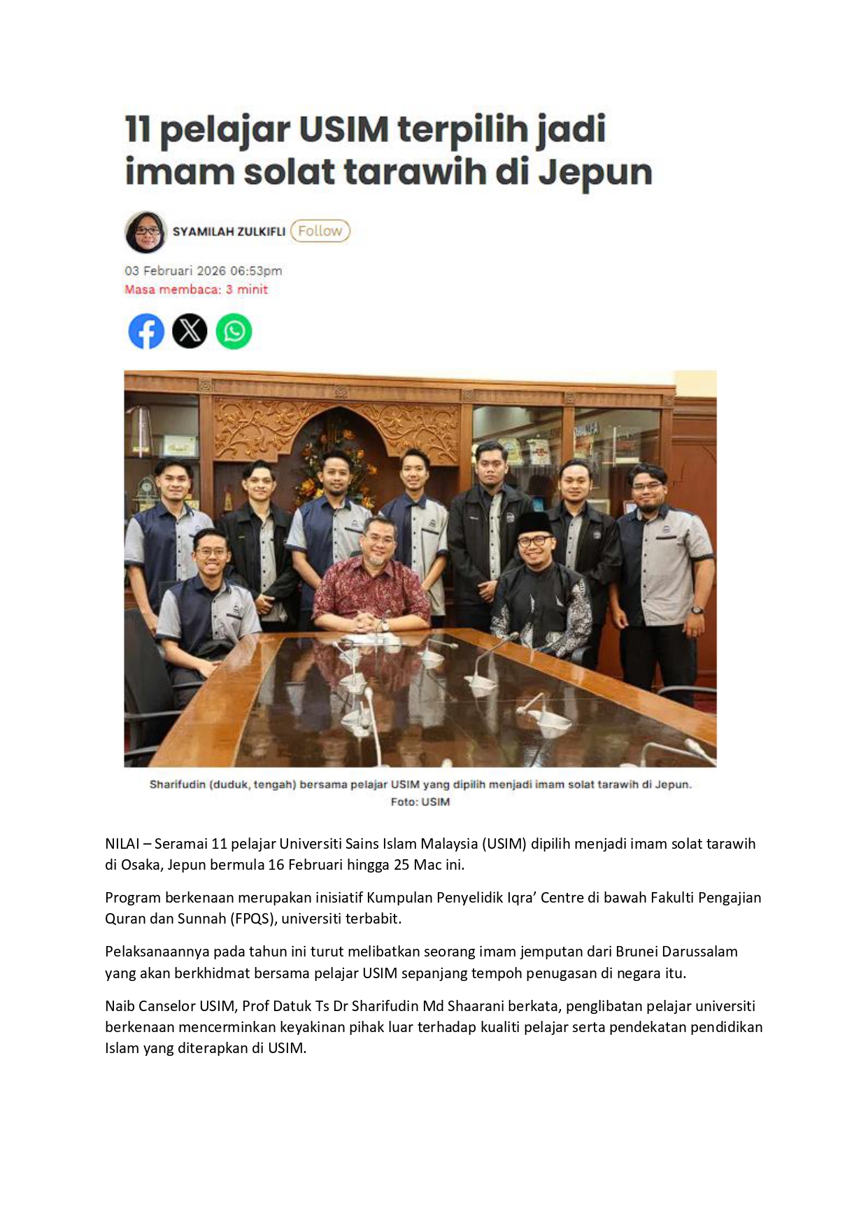 11 pelajar USIM terpilih jadi imam solat tarawih di Jepun