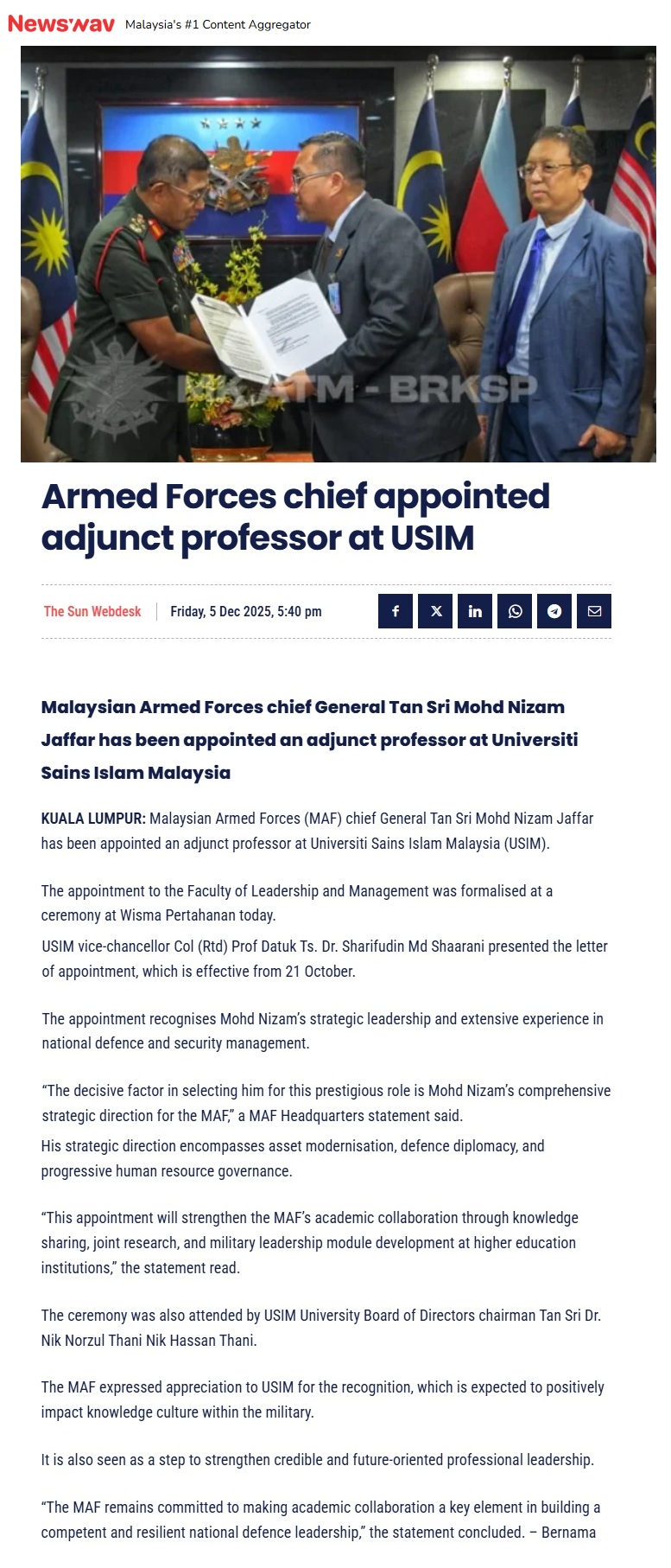 ARMED FORCES APPOINTED ADJUNCT PROFESSOR AT USIM