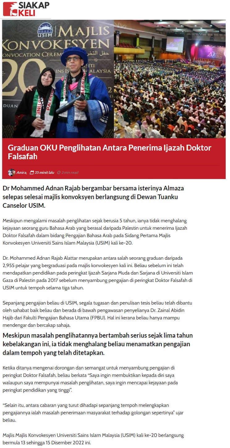 Graduan OKU Penglihatan Antara Penerima Ijazah Doktor Falsafah