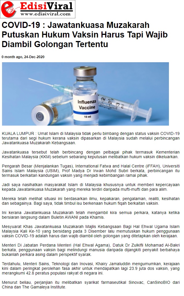 Covid-19; Jawatankuasa Muzakarah Putuskan Hukum Vaksin Harus Tapi Wajib Diambil Golongan Tertentu