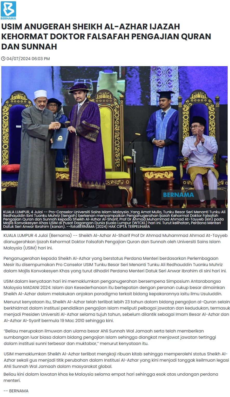 USIM anugerah Sheikh Al-Azhar ijazah kehormat doktor falsafah pengajian quran dan sunnah
