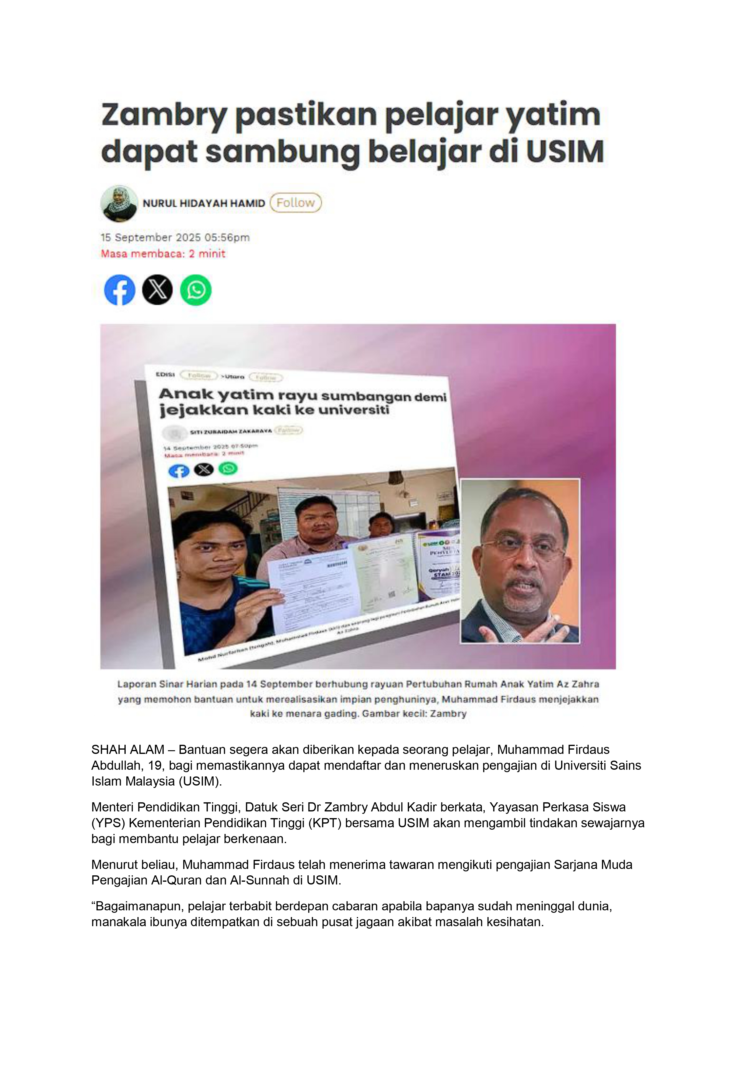 Zambry pastikan pelajar yatim dapat sambung belajar di USIM