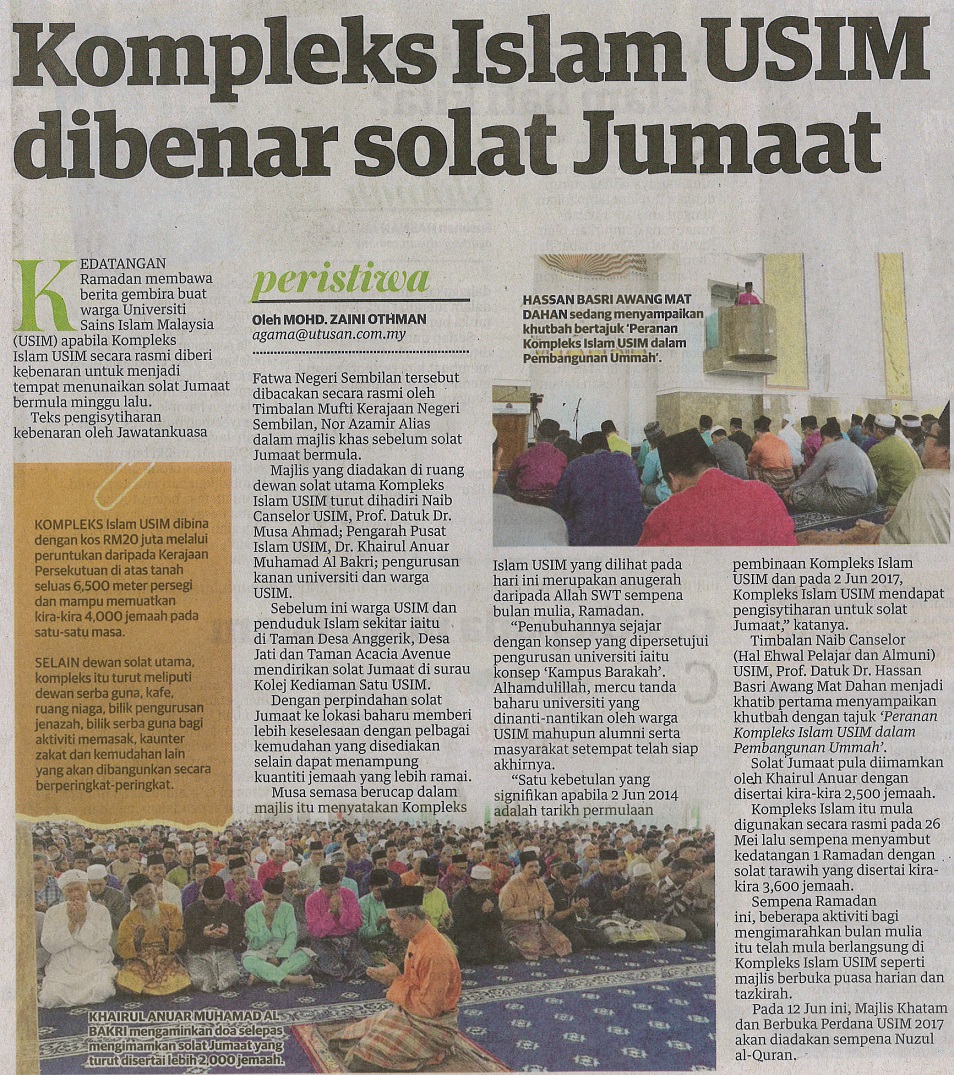 UTUSAN MALAYSIA - KOMPLEKS ISLAM USIM DIBENAR SOLAT JUMAAT, 9 JUN 2017, MS 28.jpg