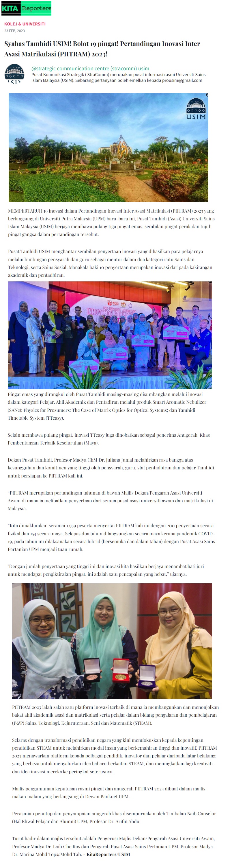 Syabas tahmidi USIM, bolot 19 pingat, Pertandingan Inovasi Inter Asasi Matrikulasi (PIITRAM2023)