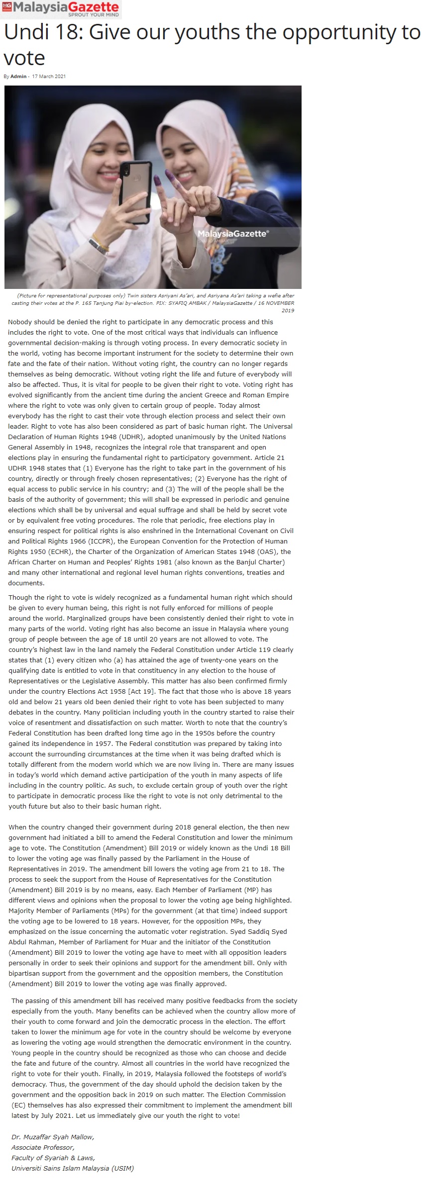 Undi 18 : Give Our Youths The Opportunity To Vote