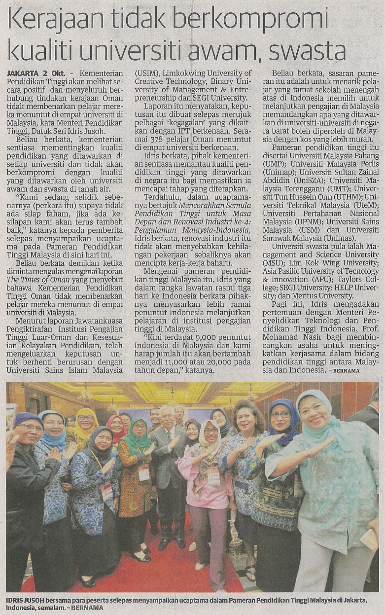 UTUSAN MALAYSIA - KERAJAAN TIDAK BERKOMPROMI KUALITI UNIVERSITI AWAM, SWASTA, 3 OKTOBER 2017, MS 3.jpg