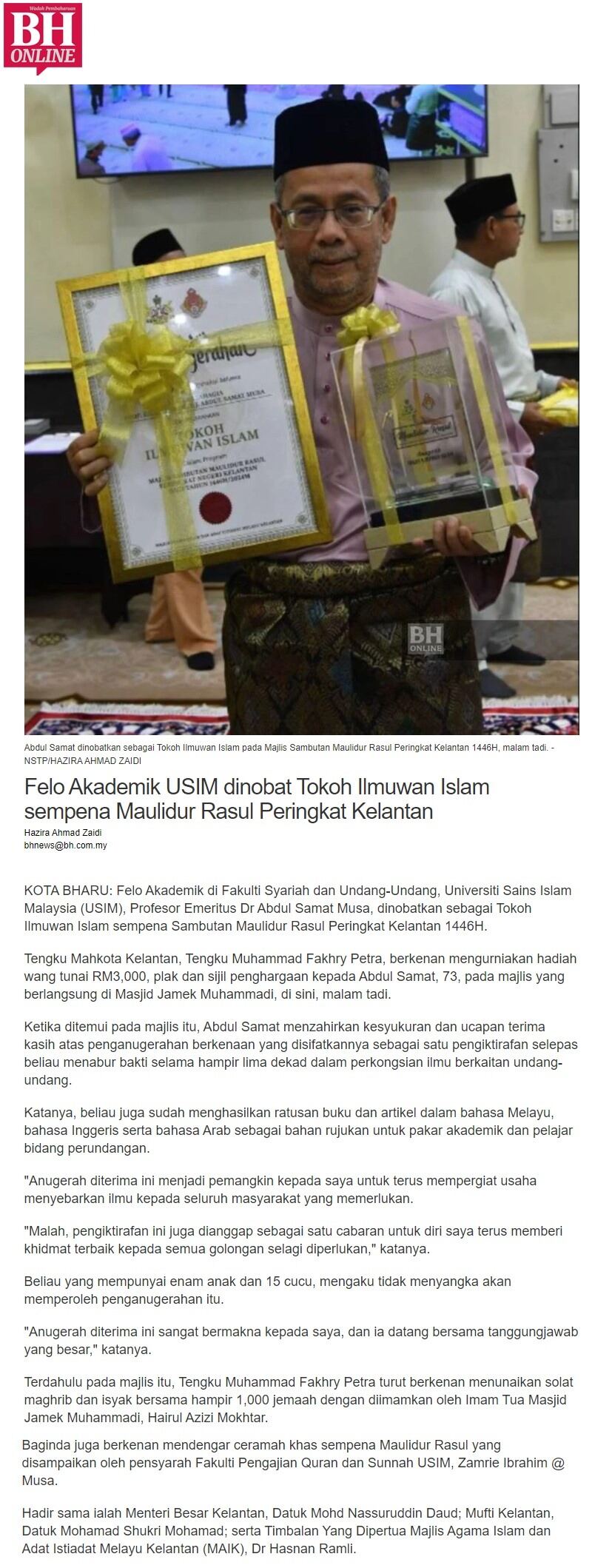 Felo Akademik USIM dinobat tokoh ilmuwan Islam sempena Maulidur Rasul peringkat Kelantan