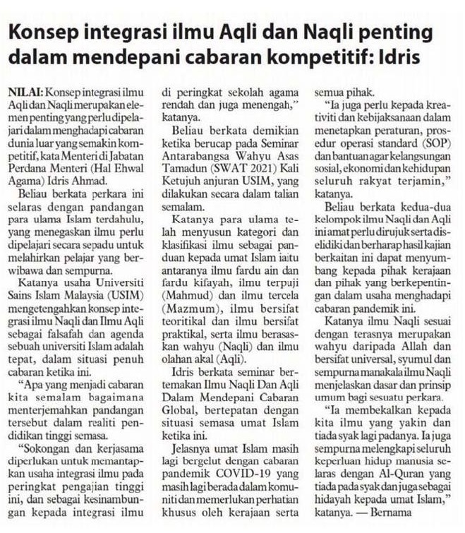 Konsep Integrasi Ilmu Aqli Dan Naqli Penting Dalam Mendepani Cabaran Kompetitif
