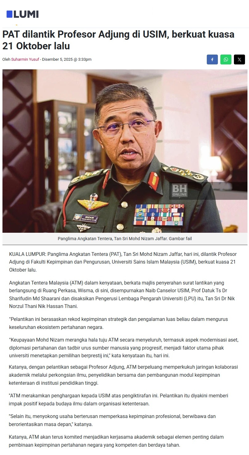 PAT DILANTIK PROFESOR ADJUNG DI USIM, BERKUATKUASA 21 OKTOBER LALU