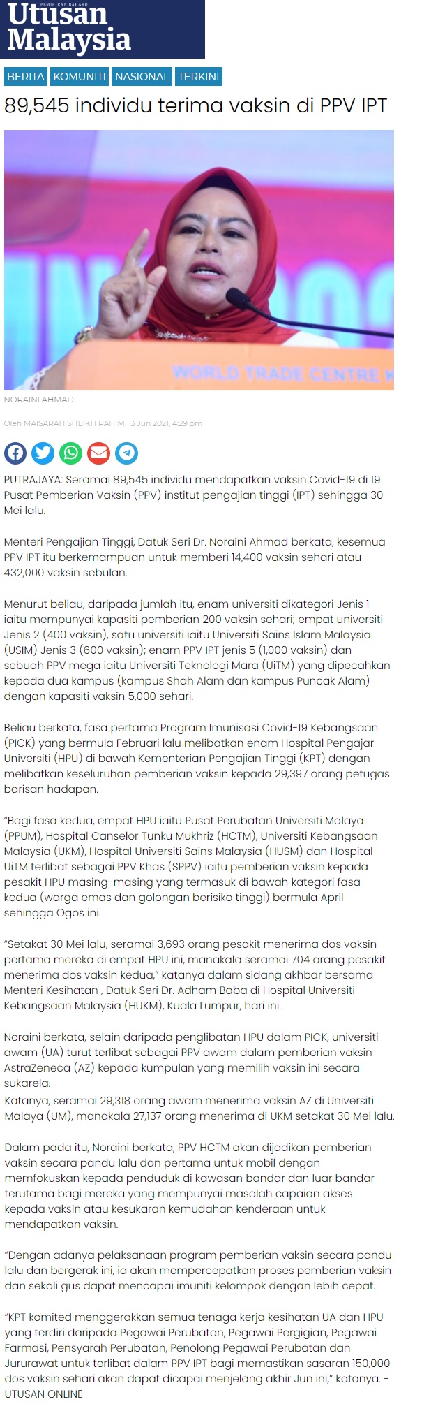 89,545 Individu Terima Vaksin Di PPV IPT
