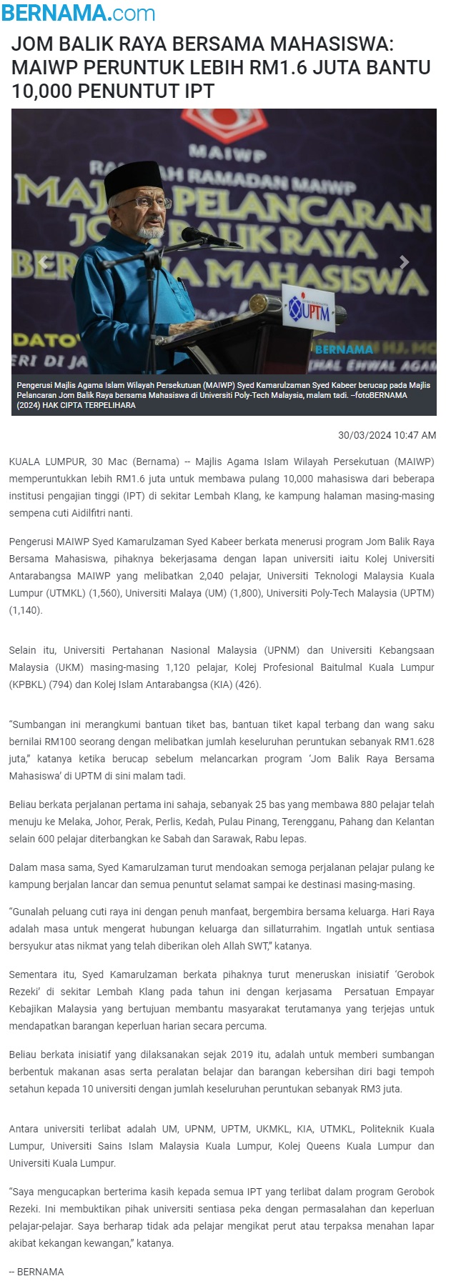 Jom balik raya bersama mahasiswa: MAIWP peruntukan lebih RM1.6 juta bantu 10000 penuntut IPT