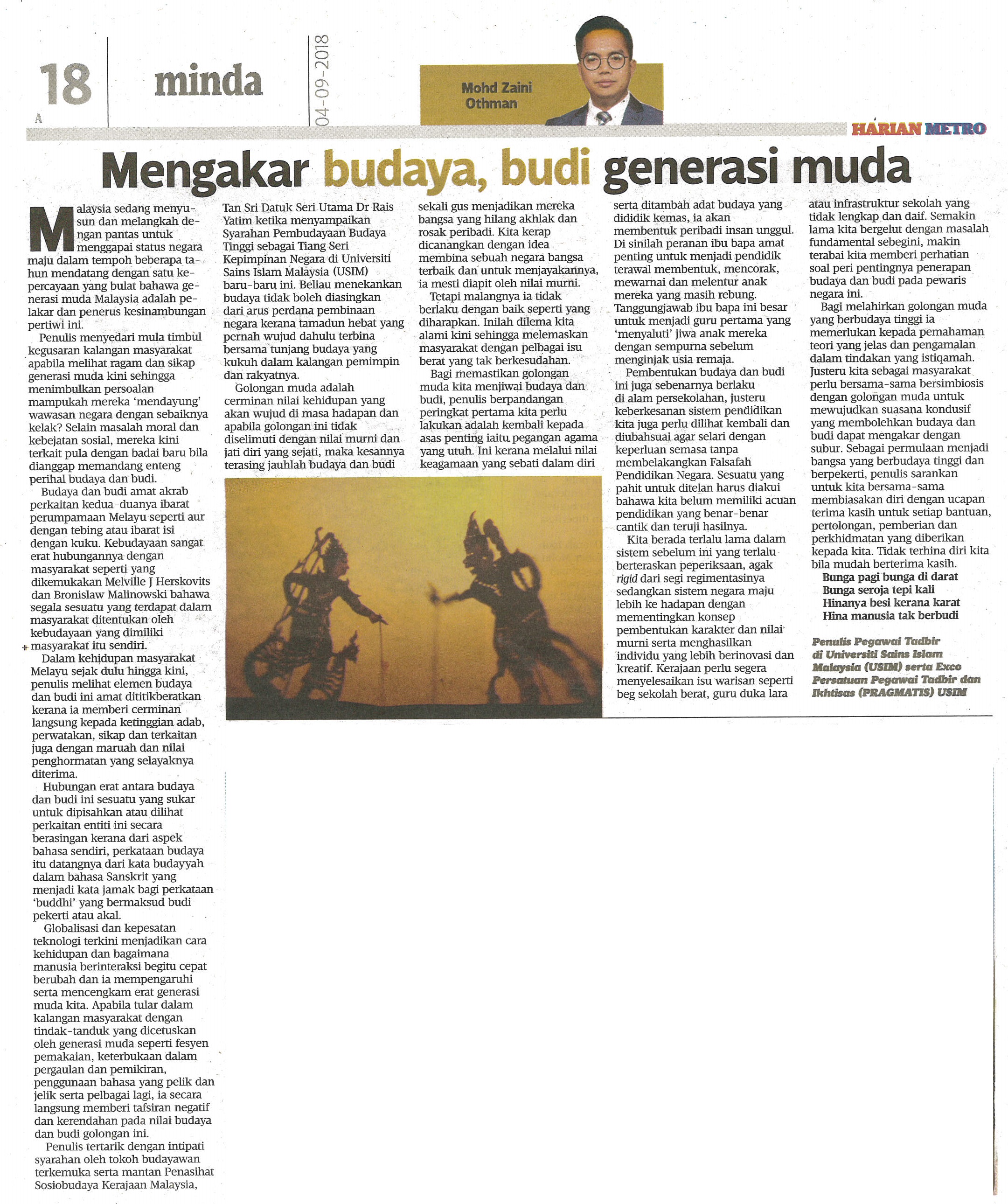 HARIAN METRO 4 SEPTEMBER 2018 MS 18 MENGAKAR BUDAYA, BUDI GENERASI MUDA.jpg