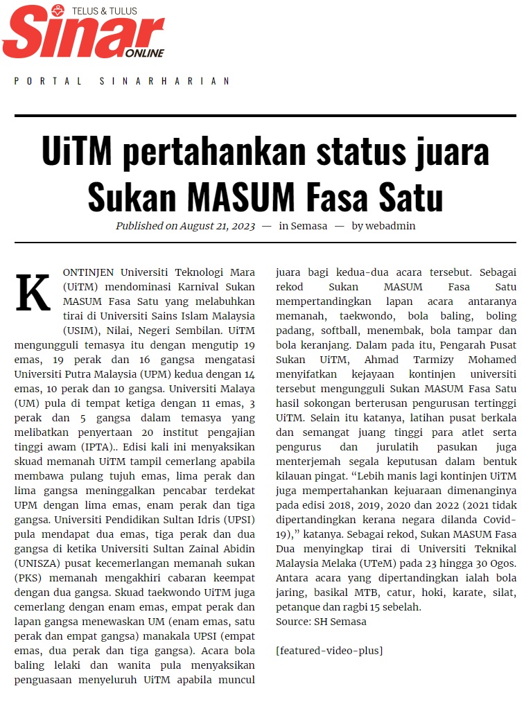 - SINAR HARIAN 21 OGOS 2023 UITM PERTAHANKAN JUARA SUKAN MASUM FASA SATU.jpg