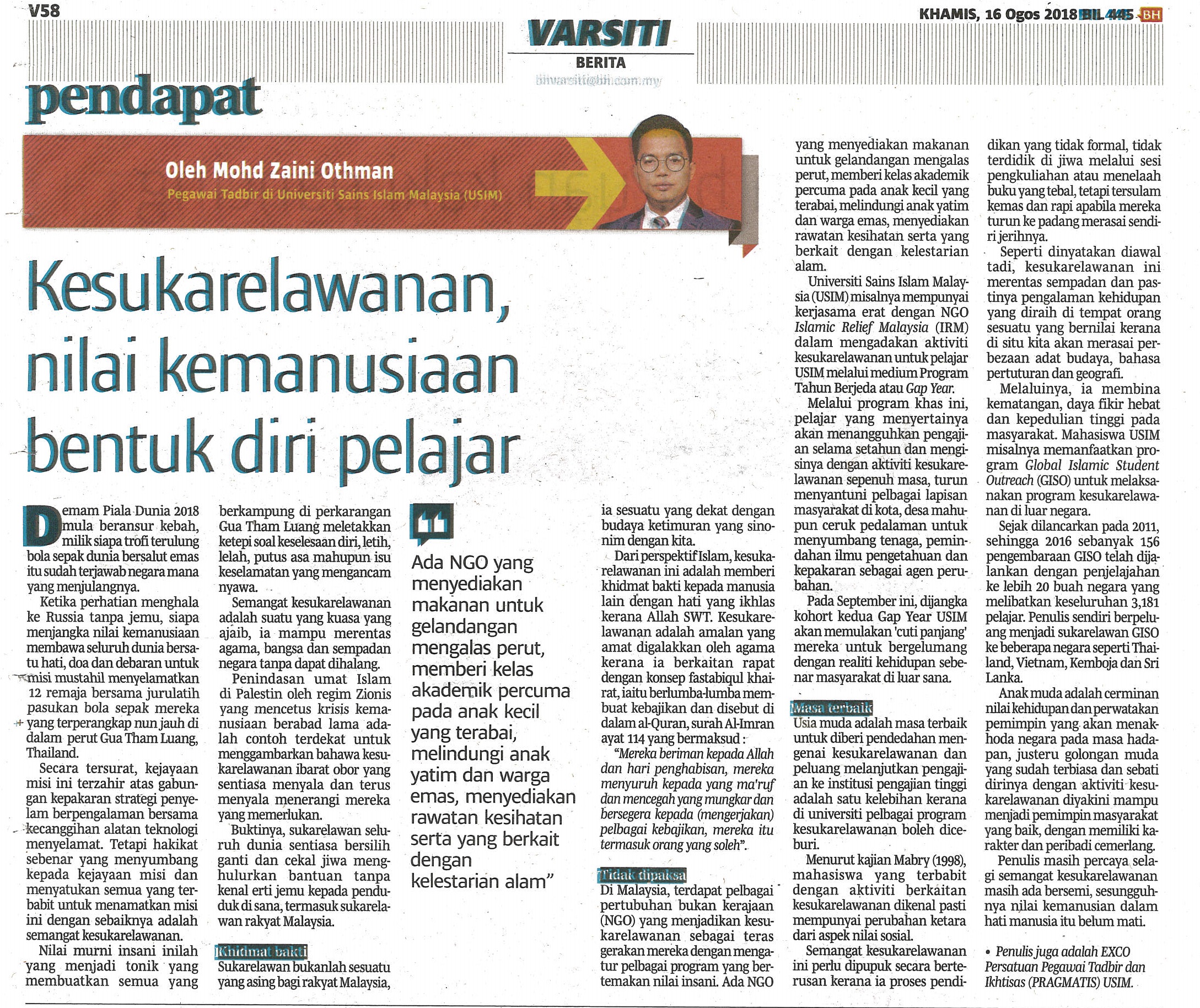 BERITA HARIAN 16 OGOS 2018 MS V58 KESUKARELAWANAN, NILAI KEMANUSIAAN BENTUK DIRI PELAJAR.jpg