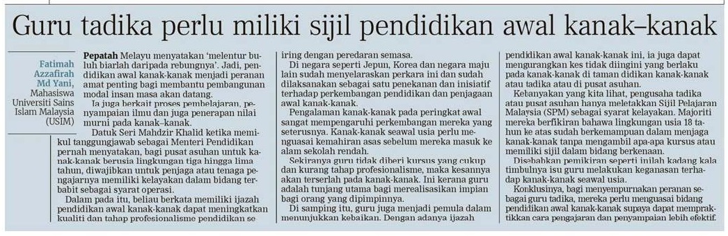 Guru Tadika Perlu Miliki Sijil Pendidikan Awal Kanak-Kanak