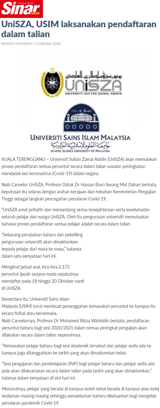 UNISZA, USIM Laksanakan Pendaftaran Dalam Talian