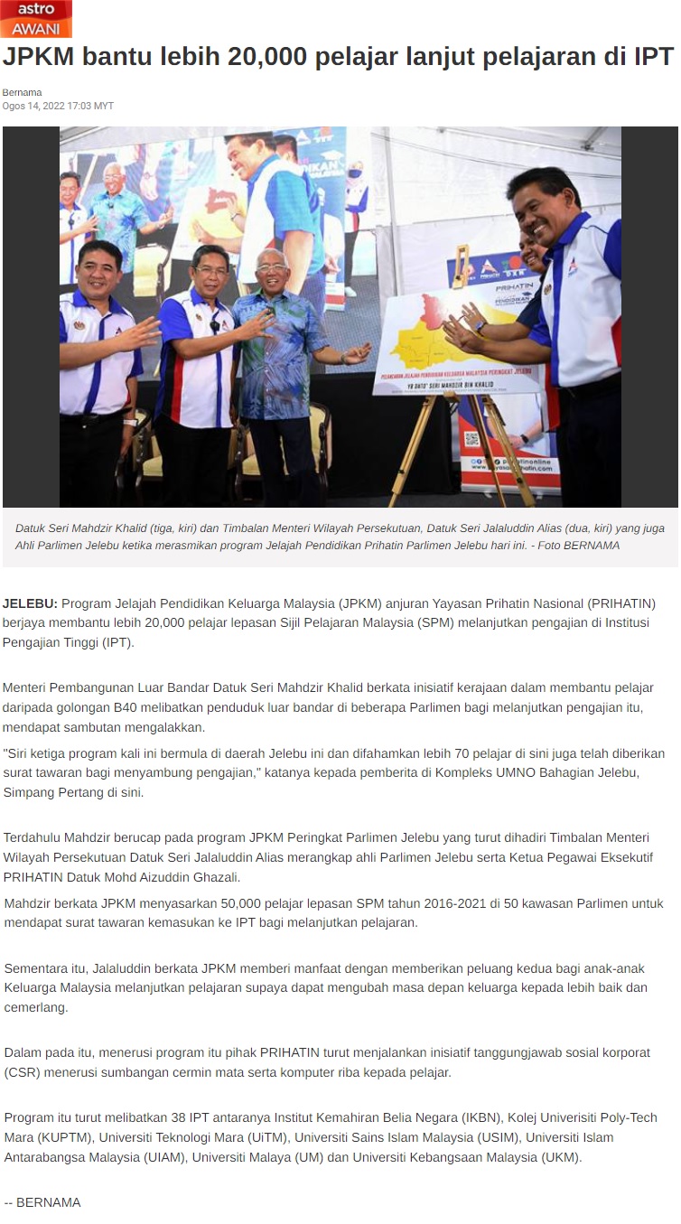 JPKM Bantu Lebih 20,000 Pelajar Lanjut Pelajaran Di IPT