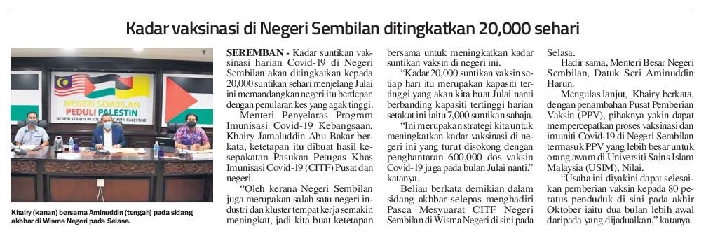 Kadar Vaksinasi Negeri Sembilan Ditingkatkan 20,000 Sehari