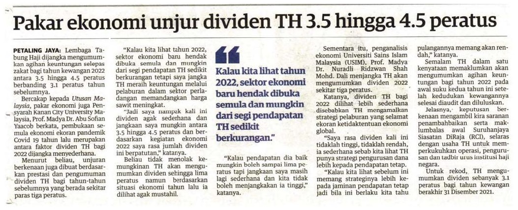 Pakar ekonomi unjur dividen TH 3.5 hingga 4.5 peratus