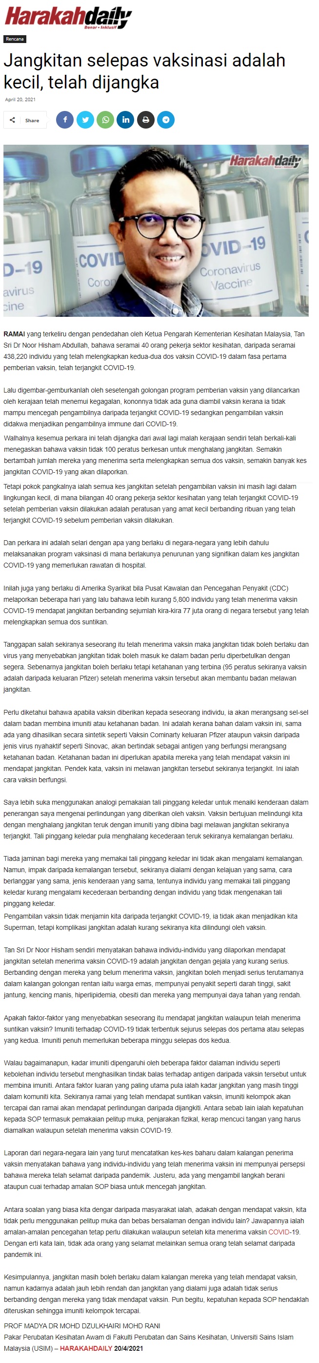 Jangkitan Selepas Vaksin Adalah Kecil, Telah Dijangka