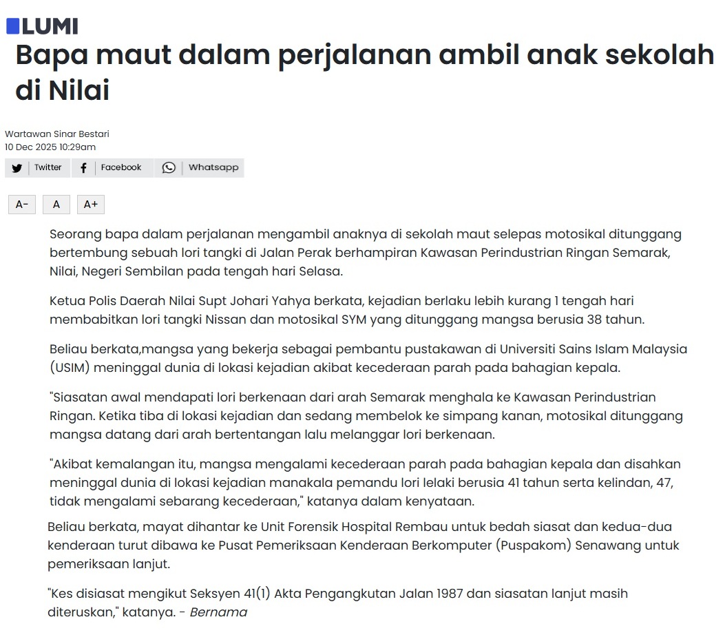 BAPA MAUT DALAM PERJALANAN AMBIL ANAK SEKOLAH DI NILAI