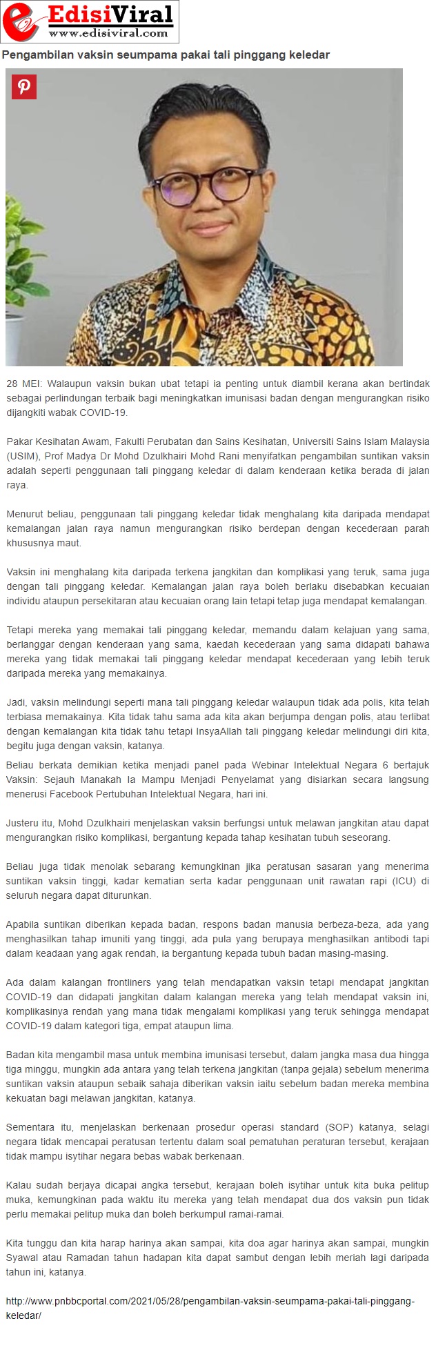Pengambilan Vaksin Seumpama Pakai Tali Pinggang Keledar