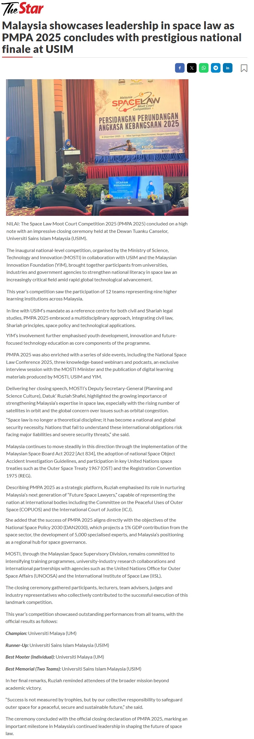 MALAYSIA SHOWCASES LEADERSHIP IN SPACE LAW AS PMPA 2025 CONCLUDES WITH PRESTIGIOUS NATIONAL FINALE AT USIM