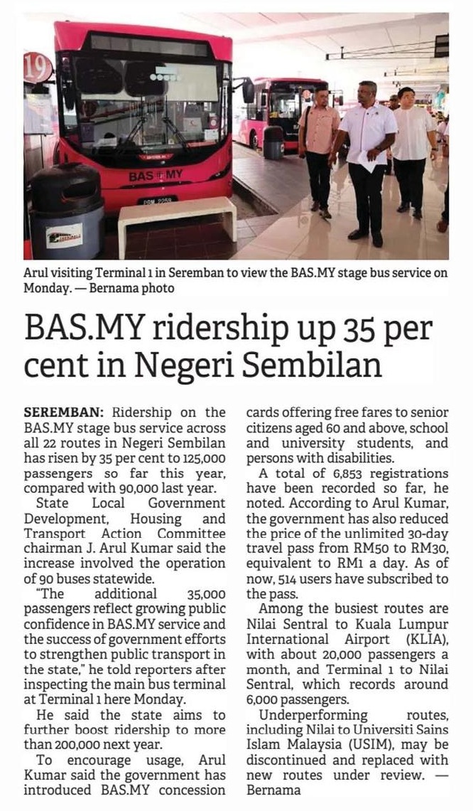 BASMY RIDERSHIP UP 35 PERCENT IN NEGERI SEMBILAN
