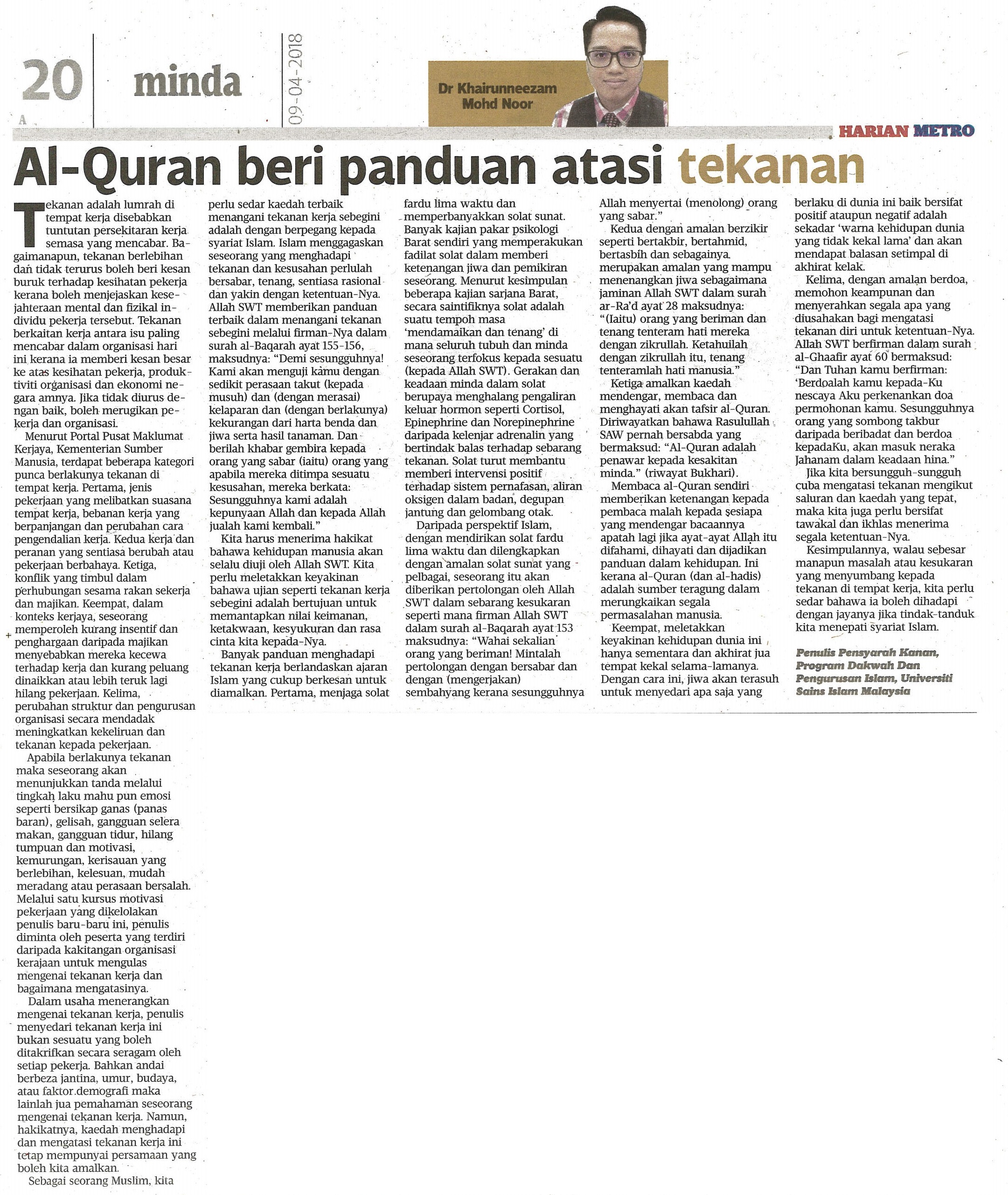 HARIAN METRO 9 APRIL 2018 MS 20 ALQURAN BERI PANDUAN ATASI TEKANAN.jpg