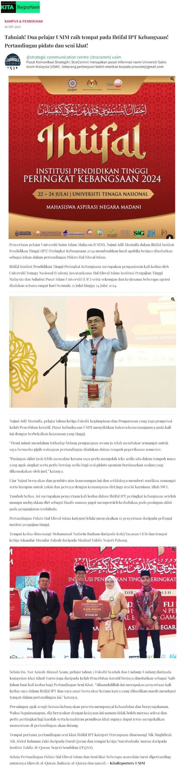 Tahniah dua pelajar USIM raih tempat pada ihtifal IPT kebangsaan pertandingan pidato dan seni khat