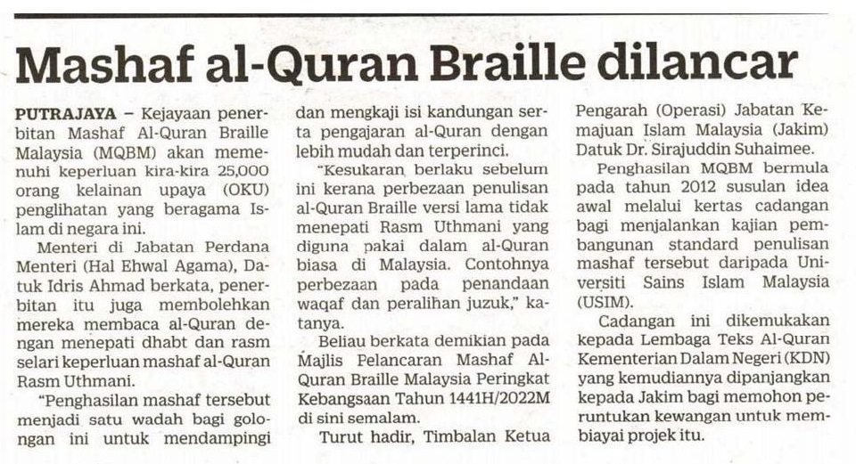 Mashaf Al-Quran Braille Dilancar