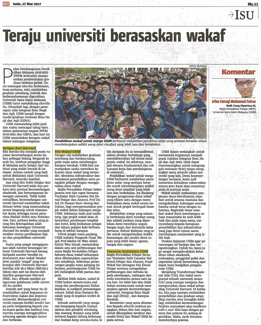 BERITA HARIAN - TERAJU UNIVERSITI BERASASKAN WAKAF, 27 MAC 2017, MS 11.jpg
