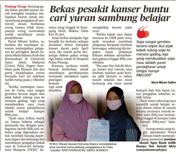 Bekas Pesakit Kanser Buntu Cari Yuran Sambung Belajar