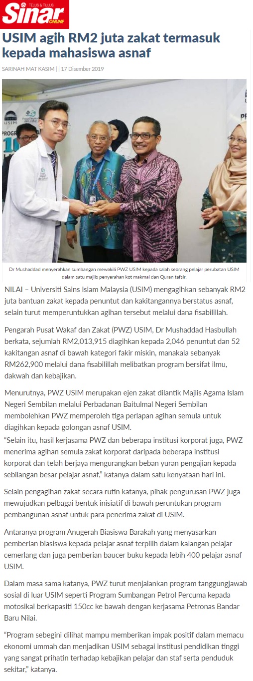 USIM Agih RM2 Juta Zakat Termasuk Kepada Mahasiswa Asnaf