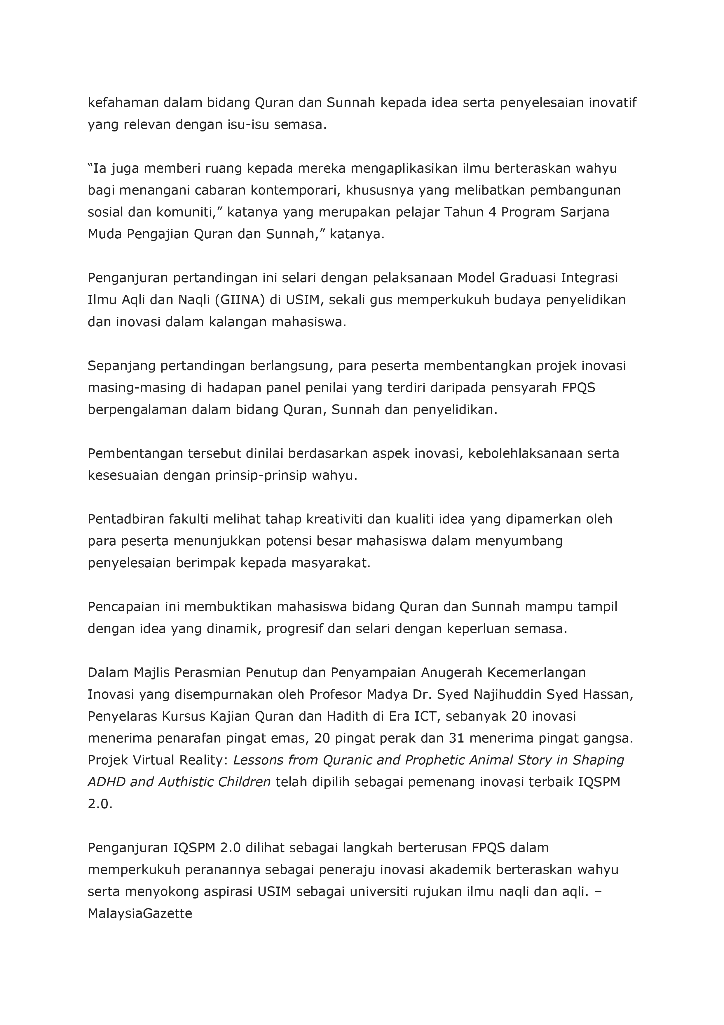 FPQS USIM terap budaya inovasi, penyelidik muda melalui IQSPM 2.0