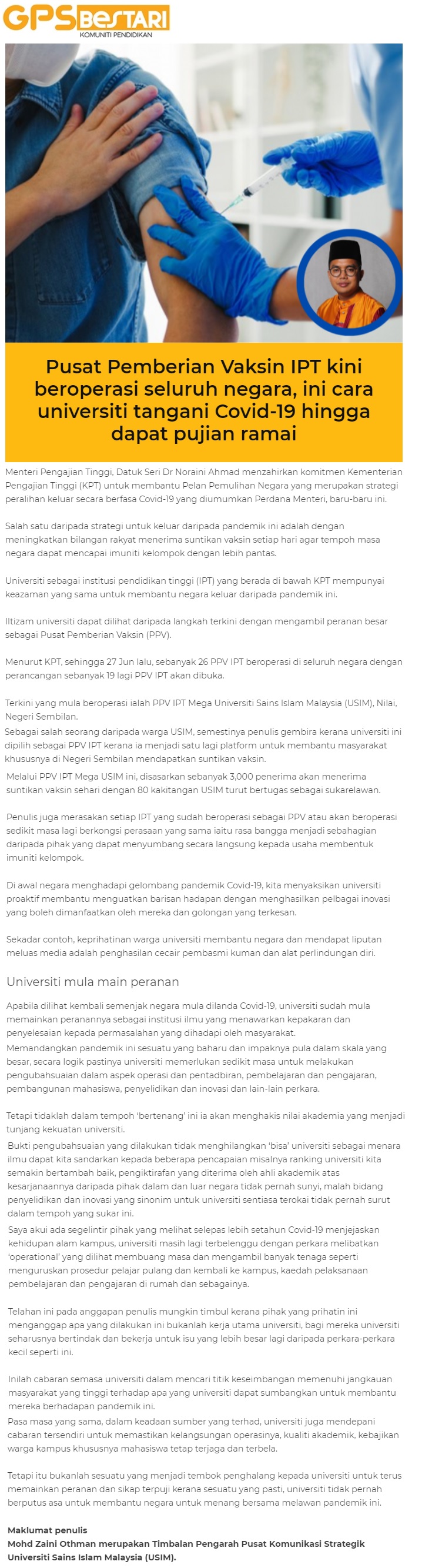 Pusat Pemberian Vaksin IPT Kini Beroperasi Seluruh Negara, Ini Cara Universiti Tangani Hingga Dapat Pujian Ramai