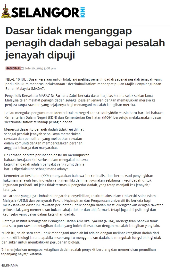Dasar Tidak Menganggap Penagih Dadah Sebagai Pesalah Jenayah Dipuji