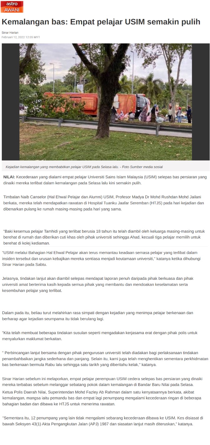 Kemalangan Bas ; Empat Pelajar USIM Semakin Pulih
