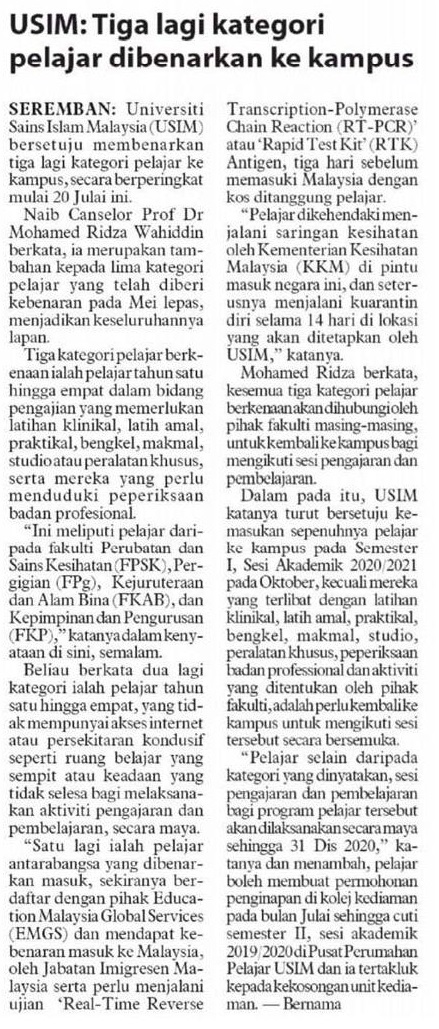 USIM : 3 Kategori Pelajar Dibenarkan Masuk Kampus
