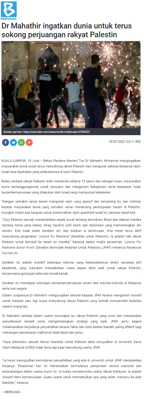 Dr Mahathir Ingatkan Dunia Untuk Terus Sokong Perjuangan Rakyat Palestin