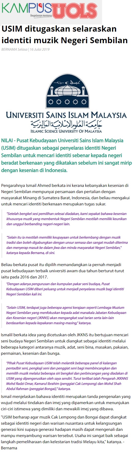 USIM Ditugaskan Selaras Identiti Muzik Negeri Sembilan