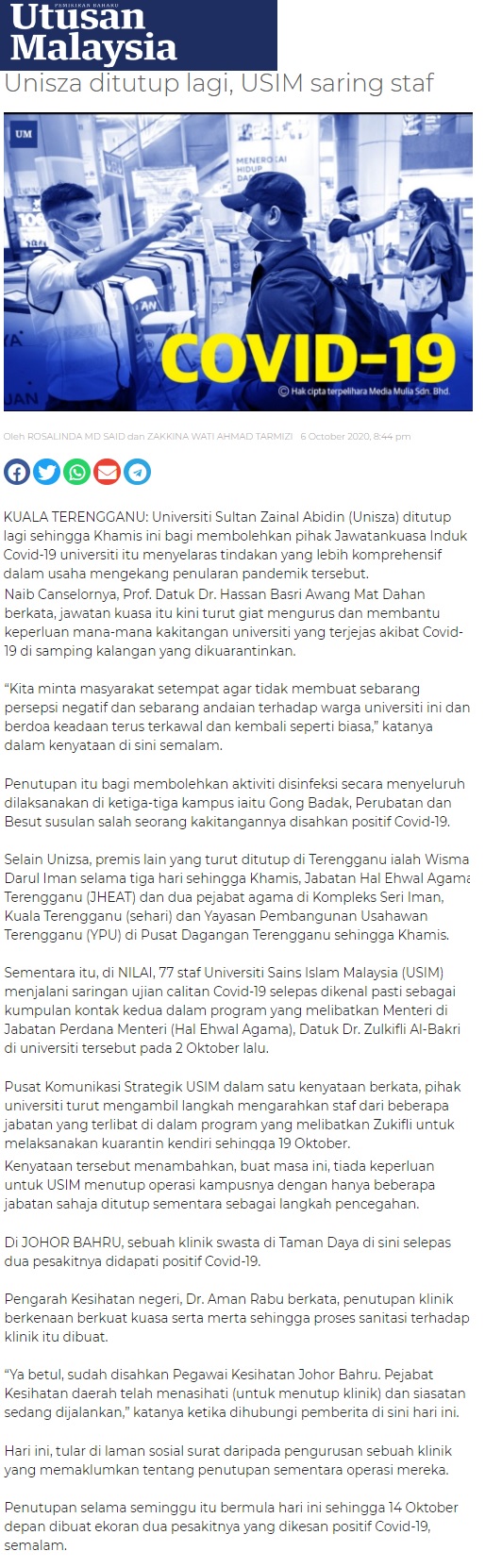 UNISZA Ditutup Lagi, USIM Saring Staf