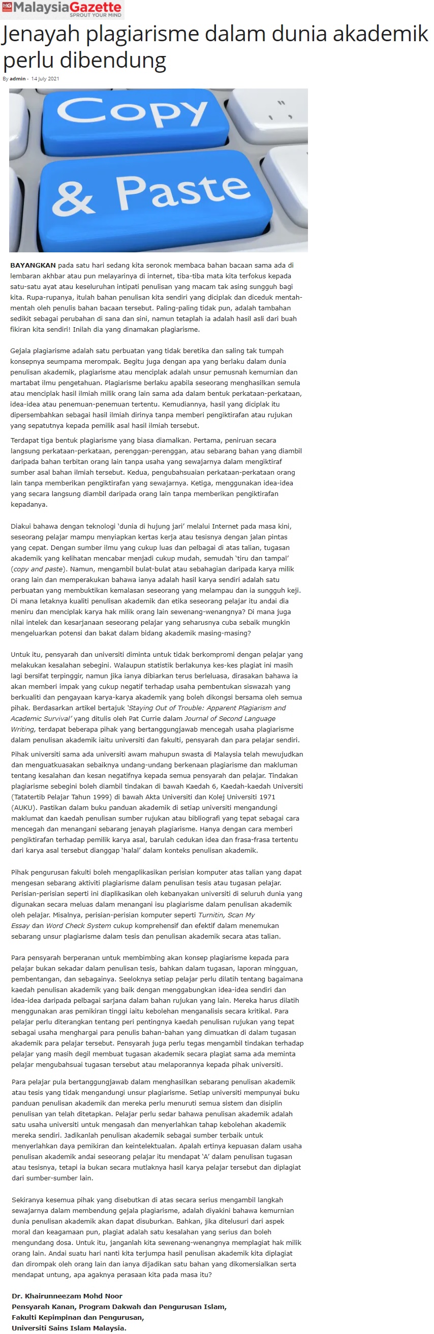 - MALAYSIA GAZETTE 14 JULAI 2021 JENAYAH PLAGIARISME DALAM DUNIA AKADEMIK PERLU DIBENDUNG.jpg