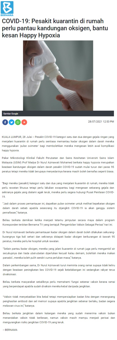 Covid-19 ; Pesakit Kuarantin Di Rumah Perlu Pantau Kandungan Oksigen, Bantu Kesan Happy Hypoxia