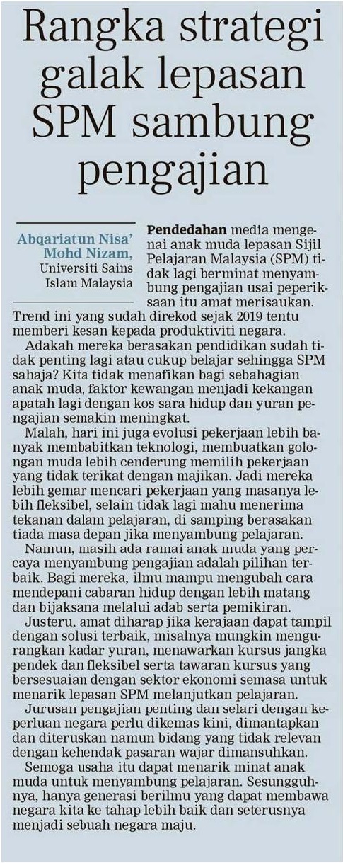 Rangka strategi galak lepasan SPM sambung pengajian