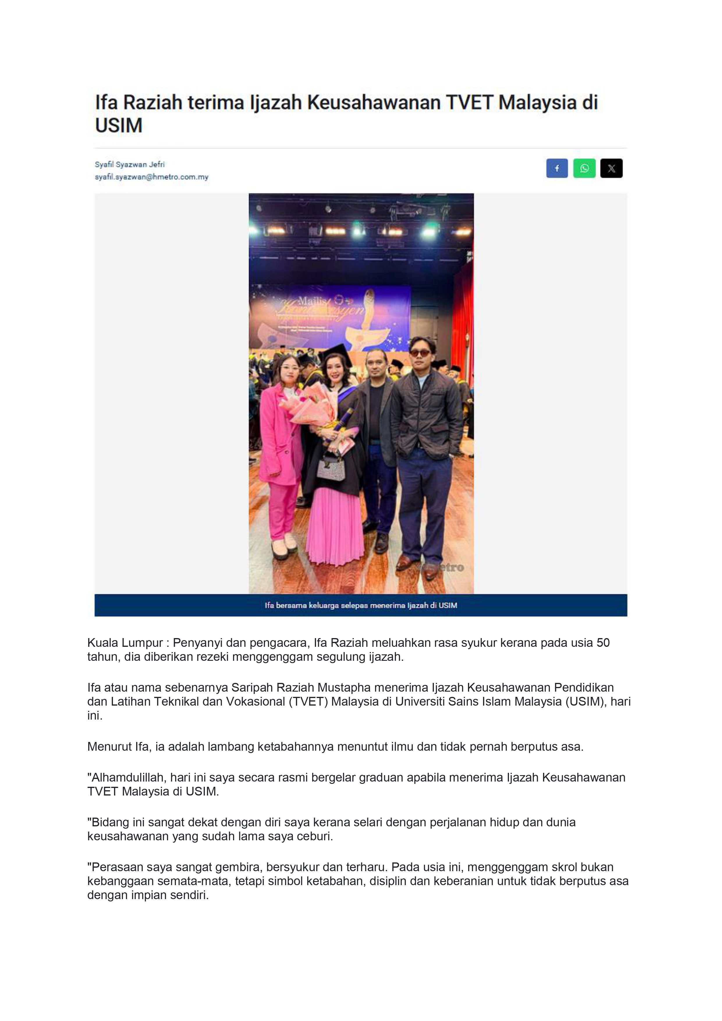 Ifa Raziah terima Ijazah Keusahawanan TVET Malaysia di USIM