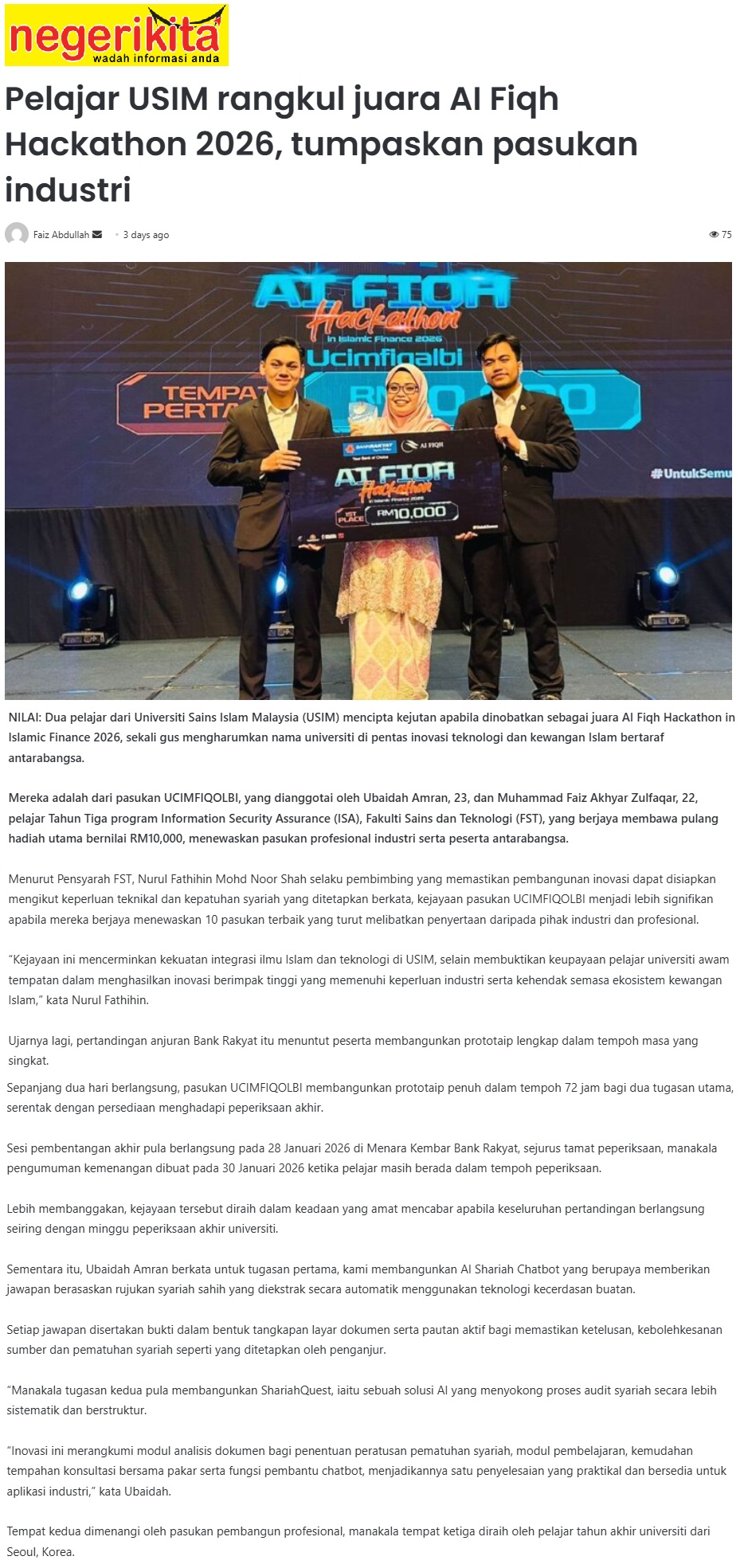 PELAJAR USIM RANGKUL JUARA ALFIQH HACKATHON 2026, TUMPASKAN PASUKAN INDUSTRI