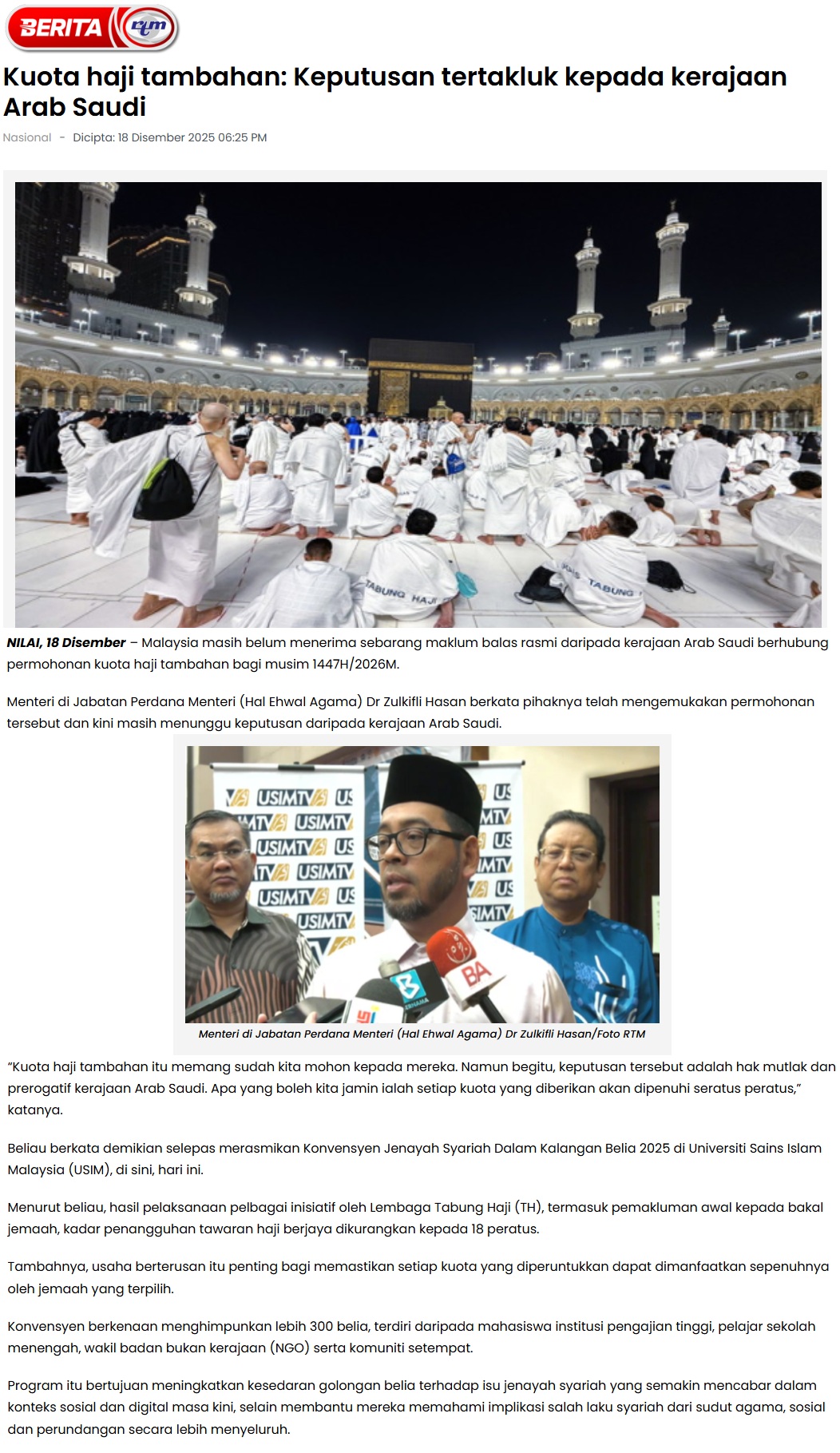 KUOTA HAJI TAMBAHAN: KEPUTUSAN TERTAKLUK KEPADA KERAJAAN ARAB SAUDI